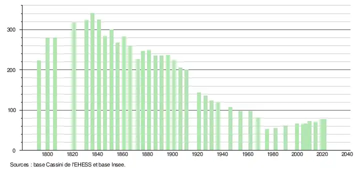 L'évolution du nombre d'habitants est connue à travers les recensements de la population effectués dans la commune depuis 1793. Pour les communes de moins de 10 000 habitants, une enquête de recensement portant sur toute la population est réalisée tous les cinq ans, les populations légales des années intermédiaires étant quant à elles estimées par interpolation ou extrapolation[17]. Pour la commune, le premier recensement exhaustif entrant dans le cadre du nouveau dispositif a été réalisé en 2004[18].