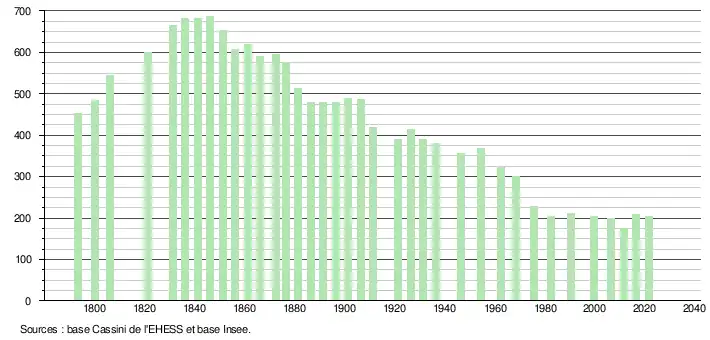 L'évolution du nombre d'habitants est connue à travers les recensements de la population effectués dans la commune depuis 1793. Pour les communes de moins de 10 000 habitants, une enquête de recensement portant sur toute la population est réalisée tous les cinq ans, les populations légales des années intermédiaires étant quant à elles estimées par interpolation ou extrapolation[24]. Pour la commune, le premier recensement exhaustif entrant dans le cadre du nouveau dispositif a été réalisé en 2006[25].