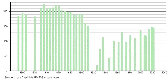 L'évolution du nombre d'habitants est connue à travers les recensements de la population effectués dans la commune depuis 1793. Pour les communes de moins de 10 000 habitants, une enquête de recensement portant sur toute la population est réalisée tous les cinq ans, les populations légales des années intermédiaires étant quant à elles estimées par interpolation ou extrapolation[23]. Pour la commune, le premier recensement exhaustif entrant dans le cadre du nouveau dispositif a été réalisé en 2008[24].