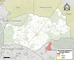 Le retrait-gonflement des sols argileux est susceptible d'engendrer des dommages importants aux bâtiments en cas d’alternance de périodes de sécheresse et de pluie. Aucune partie du territoire de la commune n'est en aléa moyen ou fort (54,2 % au niveau départemental et 48,5 % au niveau national). Sur les 159 bâtiments dénombrés sur la commune en 2019, aucun n'est en aléa moyen ou fort, à comparer aux 57 % au niveau départemental et 54 % au niveau national. Une cartographie de l'exposition du territoire national au retrait gonflement des sols argileux est disponible sur le site du BRGM[12],[Carte 2].