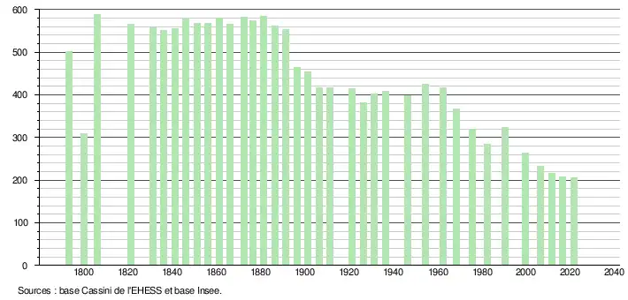 L'évolution du nombre d'habitants est connue à travers les recensements de la population effectués dans la commune depuis 1793. Pour les communes de moins de 10 000 habitants, une enquête de recensement portant sur toute la population est réalisée tous les cinq ans, les populations légales des années intermédiaires étant quant à elles estimées par interpolation ou extrapolation[15]. Pour la commune, le premier recensement exhaustif entrant dans le cadre du nouveau dispositif a été réalisé en 2006[16].