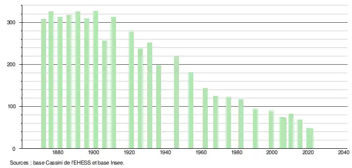 L'évolution du nombre d'habitants est connue à travers les recensements de la population effectués dans la commune depuis 1872. Pour les communes de moins de 10 000 habitants, une enquête de recensement portant sur toute la population est réalisée tous les cinq ans, les populations légales des années intermédiaires étant quant à elles estimées par interpolation ou extrapolation[23]. Pour la commune, le premier recensement exhaustif entrant dans le cadre du nouveau dispositif a été réalisé en 2005[24].