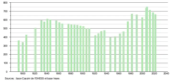 L'évolution du nombre d'habitants est connue à travers les recensements de la population effectués dans la commune depuis 1793. Pour les communes de moins de 10 000 habitants, une enquête de recensement portant sur toute la population est réalisée tous les cinq ans, les populations légales des années intermédiaires étant quant à elles estimées par interpolation ou extrapolation[26]. Pour la commune, le premier recensement exhaustif entrant dans le cadre du nouveau dispositif a été réalisé en 2007[27].