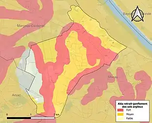 Le retrait-gonflement des sols argileux est susceptible d'engendrer des dommages importants aux bâtiments en cas d’alternance de périodes de sécheresse et de pluie. 90,9 % de la superficie communale est en aléa moyen ou fort (67,4 % au niveau départemental et 48,5 % au niveau national). Sur les 267 bâtiments dénombrés sur la commune en 2019, 267 sont en aléa moyen ou fort, soit 100 %, à comparer aux 84 % au niveau départemental et 54 % au niveau national. Une cartographie de l'exposition du territoire national au retrait gonflement des sols argileux est disponible sur le site du BRGM[19],[Carte 2].