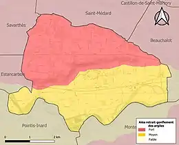 Le retrait-gonflement des sols argileux est susceptible d'engendrer des dommages importants aux bâtiments en cas d’alternance de périodes de sécheresse et de pluie. La totalité de la commune est en aléa moyen ou fort (88,8 % au niveau départemental et 48,5 % au niveau national). Sur les 417 bâtiments dénombrés sur la commune en 2019, 417 sont en aléa moyen ou fort, soit 100 %, à comparer aux 98 % au niveau départemental et 54 % au niveau national. Une cartographie de l'exposition du territoire national au retrait gonflement des sols argileux est disponible sur le site du BRGM[33],[Carte 3].