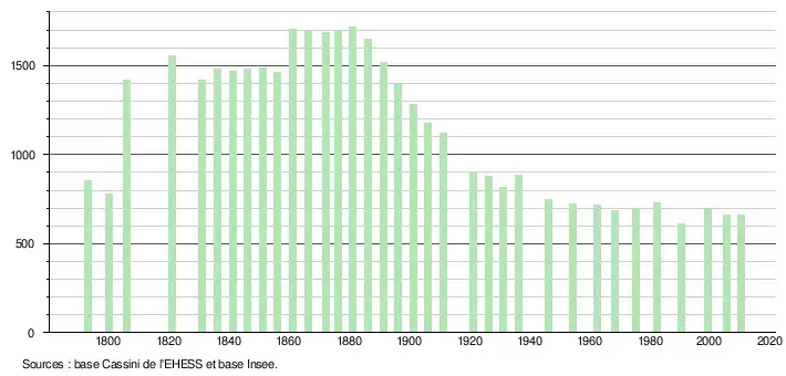 L'évolution du nombre d'habitants est connue à travers les recensements de la population effectués dans la commune depuis 1793. À partir du , les populations légales des communes sont publiées annuellement dans le cadre d'un recensement qui repose désormais sur une collecte d'information annuelle, concernant successivement tous les territoires communaux au cours d'une période de cinq ans. Pour les communes de moins de 10 000 habitants, une enquête de recensement portant sur toute la population est réalisée tous les cinq ans, les populations légales des années intermédiaires étant quant à elles estimées par interpolation ou extrapolation[9]. Pour la commune, le premier recensement exhaustif entrant dans le cadre du nouveau dispositif a été réalisé en 2005[10],[Note 1].