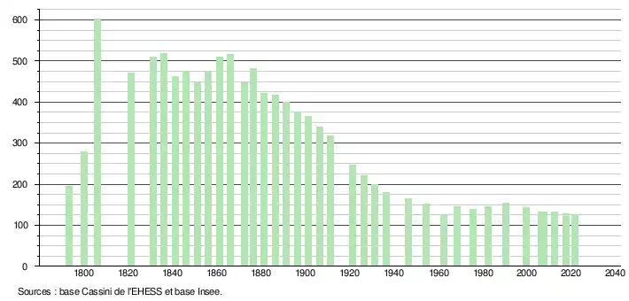 L'évolution du nombre d'habitants est connue à travers les recensements de la population effectués dans la commune depuis 1793. Pour les communes de moins de 10 000 habitants, une enquête de recensement portant sur toute la population est réalisée tous les cinq ans, les populations légales des années intermédiaires étant quant à elles estimées par interpolation ou extrapolation[33]. Pour la commune, le premier recensement exhaustif entrant dans le cadre du nouveau dispositif a été réalisé en 2007[34].