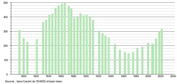 L'évolution du nombre d'habitants est connue à travers les recensements de la population effectués dans la commune depuis 1793. Pour les communes de moins de 10 000 habitants, une enquête de recensement portant sur toute la population est réalisée tous les cinq ans, les populations légales des années intermédiaires étant quant à elles estimées par interpolation ou extrapolation[21]. Pour la commune, le premier recensement exhaustif entrant dans le cadre du nouveau dispositif a été réalisé en 2007[22].