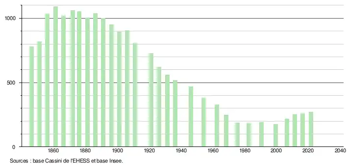 L'évolution du nombre d'habitants est connue à travers les recensements de la population effectués dans la commune depuis 1846. Pour les communes de moins de 10 000 habitants, une enquête de recensement portant sur toute la population est réalisée tous les cinq ans, les populations légales des années intermédiaires étant quant à elles estimées par interpolation ou extrapolation[21]. Pour la commune, le premier recensement exhaustif entrant dans le cadre du nouveau dispositif a été réalisé en 2006[22].
