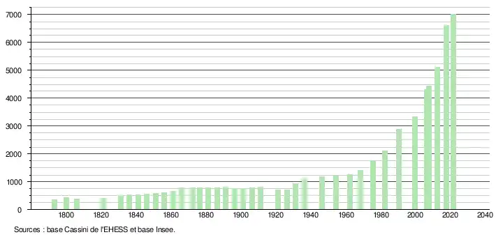 | L'évolution du nombre d'habitants est connue à travers les recensements de la population effectués dans la commune depuis 1793. Pour les communes de moins de 10 000 habitants, une enquête de recensement portant sur toute la population est réalisée tous les cinq ans, les populations légales des années intermédiaires étant quant à elles estimées par interpolation ou extrapolation[33]. Pour la commune, le premier recensement exhaustif entrant dans le cadre du nouveau dispositif a été réalisé en 2007[34]. En 2021, la commune comptait 7 007 habitants[Note 4], en augmentation de 15,06 % par rapport à 2015 (Landes : +4,9 %, France hors Mayotte : +1,84 %). |