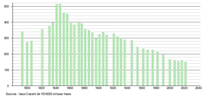 L'évolution du nombre d'habitants est connue à travers les recensements de la population effectués dans la commune depuis 1793. Pour les communes de moins de 10 000 habitants, une enquête de recensement portant sur toute la population est réalisée tous les cinq ans, les populations légales des années intermédiaires étant quant à elles estimées par interpolation ou extrapolation[53]. Pour la commune, le premier recensement exhaustif entrant dans le cadre du nouveau dispositif a été réalisé en 2006[54].