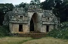 Le site abrite un grand palais à deux étages, quelques temples pyramidaux et une sorte d'arc de triomphe décoré. L'architecture est de style Puuc et fait un usage excessif de structures imbriquant des pierres taillées sur mesure et de peintures, notamment des masques de Chac, le dieu de la pluie au long nez.