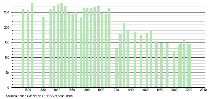 L'évolution du nombre d'habitants est connue à travers les recensements de la population effectués dans la commune depuis 1793. Pour les communes de moins de 10 000 habitants, une enquête de recensement portant sur toute la population est réalisée tous les cinq ans, les populations légales des années intermédiaires étant quant à elles estimées par interpolation ou extrapolation[18]. Pour la commune, le premier recensement exhaustif entrant dans le cadre du nouveau dispositif a été réalisé en 2008[19].