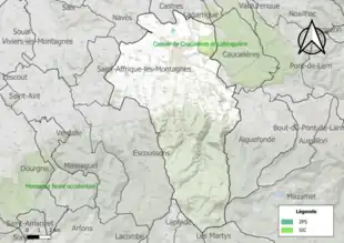 et une ZNIEFF de type 2[Note 4],[22] : la « montagne Noire (versant Nord) » (31 971 ha), couvrant 37 communes dont 14 dans l'Aude, deux dans la Haute-Garonne, trois dans l'Hérault et 18 dans le Tarn[26].