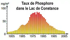 La qualité de son eau s'est fortement dégradée depuis le XVIe siècle, notamment à cause d'une eutrophisation, d'origine humaine et agricole, qui a augmenté jusqu'au début des années 1980, due aux nitrates et au phosphore. Depuis ce pic de pollution par le phosphore et grâce à la construction de stations d'épuration et à une meilleure gestion des eaux de ruissellement dans les trois pays riverains, l'eutrophisation par le phosphore a nettement diminué et a presque atteint sa concentration naturelle. Aujourd'hui, l'eau du lac de Constance a retrouvé une bonne qualité. La présence de truites de lac, dont le nombre est en augmentation, en est un indicateur[12]. Mais d'autres paramètres restent préoccupants et à prendre en compte : température, nitrates, métaux lourds, perturbateurs endocriniens, etc.