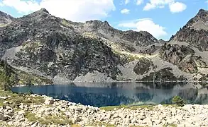 - Après le refuge, continuer sur le GR 10 vers le sud. Au premier laquet ((2 335 m) à environ 15 minutes du refuge, piquer à l'est en hors sentier jusqu'à un petit col au pied de la muraille du Pic Prada. On arrive au lac Arredoun (arrondi) en un petit quart d'heure.