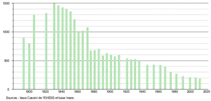 L'évolution du nombre d'habitants est connue à travers les recensements de la population effectués dans la commune depuis 1793. À partir du , les populations légales des communes sont publiées annuellement dans le cadre d'un recensement qui repose désormais sur une collecte d'information annuelle, concernant successivement tous les territoires communaux au cours d'une période de cinq ans. Pour les communes de moins de 10 000 habitants, une enquête de recensement portant sur toute la population est réalisée tous les cinq ans, les populations légales des années intermédiaires étant quant à elles estimées par interpolation ou extrapolation[1]. Pour la commune, le premier recensement exhaustif entrant dans le cadre du nouveau dispositif a été réalisé en 2006[2],[Note 1].