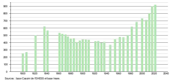 L'évolution du nombre d'habitants est connue à travers les recensements de la population effectués dans la commune depuis 1800. Pour les communes de moins de 10 000 habitants, une enquête de recensement portant sur toute la population est réalisée tous les cinq ans, les populations légales des années intermédiaires étant quant à elles estimées par interpolation ou extrapolation[21]. Pour la commune, le premier recensement exhaustif entrant dans le cadre du nouveau dispositif a été réalisé en 2006[22].