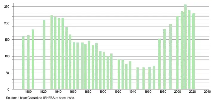L'évolution du nombre d'habitants est connue à travers les recensements de la population effectués dans la commune depuis 1793. Pour les communes de moins de 10 000 habitants, une enquête de recensement portant sur toute la population est réalisée tous les cinq ans, les populations légales des années intermédiaires étant quant à elles estimées par interpolation ou extrapolation[15]. Pour la commune, le premier recensement exhaustif entrant dans le cadre du nouveau dispositif a été réalisé en 2005[16].