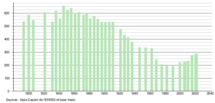 L'évolution du nombre d'habitants est connue à travers les recensements de la population effectués dans la commune depuis 1793. Pour les communes de moins de 10 000 habitants, une enquête de recensement portant sur toute la population est réalisée tous les cinq ans, les populations légales des années intermédiaires étant quant à elles estimées par interpolation ou extrapolation[23]. Pour la commune, le premier recensement exhaustif entrant dans le cadre du nouveau dispositif a été réalisé en 2005[24].