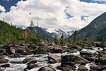 Plus près des sommets, les prairies à hautes herbes sont remplacées par des prairies alpines à herbes basses, des dryades et des toundras arbustives, dans lesquelles prédominent les espèces naines de bouleaux, des dryas et des airelles. Les trois ceintures sont traversées ici et là par des rivières de pierre (« kurums ») et des éboulis, sur lesquels la végétation est presque sous-développée. Sur les rives, on trouve parfois des zones marécageuses occupées par des graminées peu exigeantes, des carex, des populages des marais et des racines d'or. Des espèces rares de plantes se trouvent à proximité des lacs de la Moulta, dont Allium altaicum, Hedysarum theinum, Rhaponticum carthamoides, Rhodiola algida, Rhodiola quadrifida. Rosa oxyacantha et la racine d'or sont ici particulièrement abondantes[3],[4],[11].