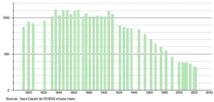 L'évolution du nombre d'habitants est connue à travers les recensements de la population effectués dans la commune depuis 1793. Pour les communes de moins de 10 000 habitants, une enquête de recensement portant sur toute la population est réalisée tous les cinq ans, les populations légales des années intermédiaires étant quant à elles estimées par interpolation ou extrapolation[20]. Pour la commune, le premier recensement exhaustif entrant dans le cadre du nouveau dispositif a été réalisé en 2004[21].