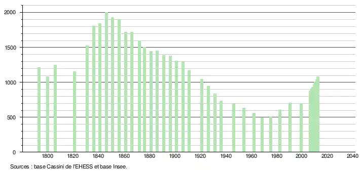 L'évolution du nombre d'habitants est connue à travers les recensements de la population effectués dans la commune depuis 1793. Pour les communes de moins de 10 000 habitants, une enquête de recensement portant sur toute la population est réalisée tous les cinq ans, les populations légales des années intermédiaires étant quant à elles estimées par interpolation ou extrapolation[18]. Pour la commune, le premier recensement exhaustif entrant dans le cadre du nouveau dispositif a été réalisé en 2008[19].