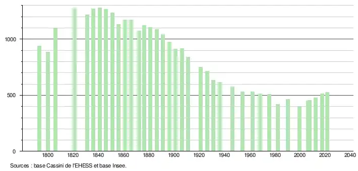 L'évolution du nombre d'habitants est connue à travers les recensements de la population effectués dans la commune depuis 1793. Pour les communes de moins de 10 000 habitants, une enquête de recensement portant sur toute la population est réalisée tous les cinq ans, les populations légales des années intermédiaires étant quant à elles estimées par interpolation ou extrapolation[38]. Pour la commune, le premier recensement exhaustif entrant dans le cadre du nouveau dispositif a été réalisé en 2007[39].