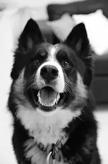 Yeux : droits ou écartés, en forme d'amande, non proéminents, ni enfoncés. Bleus, noirs ou couleur noisette (les yeux vairons sont acceptés). Les paupières sont bordées de noir ou de la couleur de la truffe qui, elle, peut être décolorée en partie, sur un fond blanc. Défaut : de grands yeux ronds, la troisième paupière présente, yeux exorbités.