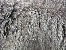 La toison représente l'ensemble des poils d'un animal exploitables comme laine. Les poils de lapin et de lièvre sont utilisables comme une laine, ils sont notamment feutrables[3]. Le pelage des moutons comprend donc le poil de bourre (le duvet chez d'autres espèces) produit par les follicules secondaires et le poil de jarre ou jard raide produit par les follicules primaires. La vraie laine comprend essentiellement du poil de bourre.