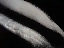 - le cycle peigné, suivi de préférence par les laines fines. Elles sortent de la carde sous forme de ruban continu, souple et homogène, dit ruban de carde. Le ruban subira l'opération de peignage avant d'être transformé en fil. La laine peignée donnera des tissus et des tricots d'aspect sec et fin ;