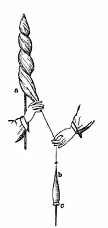 Le filage peut se faire de manière industrielle ou artisanale, à la main, à l'aide d'un fuseau (bobine de fil) ou d'un rouet, machine simple qui automatise le travail au fuseau.