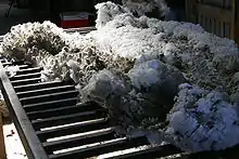 Naturellement grasses, les toisons retiennent poussières et débris végétaux. Aussi cette laine, dite laine brute, est-elle d'abord lavée et séchée. Le lavage était autrefois souvent réalisé dans des lavoirs à laine assez semblables aux lavoirs publics[21].