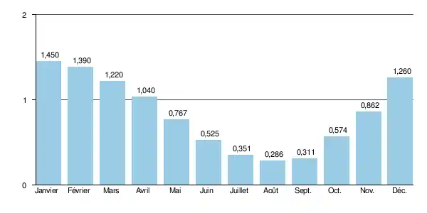 Sur cette période d'observation, le débit journalier maximal a été observé le pour 14,40 m3/s. Le débit instantané maximal a été observé le même [note 3] avec 17,90 m3/s en même temps que la hauteur maximale instantanée de 163 cm soit 1,63 m[2].