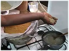 « La farine de mil étant réduite en grain [...], on la fait cuire dans une marmite avec de l'eau pure, jusqu'à la consistance d'une bouillie ; alors on la verse dans une calebasse, on y met du lait aigre-doux, ou du beurre cuit, ou une décoction de fruits de tamarin, ou de pulpe du fruit du pain-de-singe. On le sucre quelquefois avec du miel[5]. »