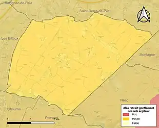Le retrait-gonflement des sols argileux est susceptible d'engendrer des dommages importants aux bâtiments en cas d’alternance de périodes de sécheresse et de pluie. La totalité de la commune est en aléa moyen ou fort (67,4 % au niveau départemental et 48,5 % au niveau national). Sur les 304 bâtiments dénombrés sur la commune en 2019, 304 sont en aléa moyen ou fort, soit 100 %, à comparer aux 84 % au niveau départemental et 54 % au niveau national. Une cartographie de l'exposition du territoire national au retrait gonflement des sols argileux est disponible sur le site du BRGM[21],[Carte 2].