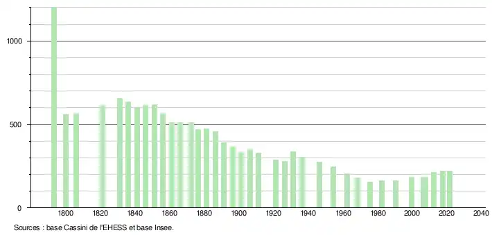 L'évolution du nombre d'habitants est connue à travers les recensements de la population effectués dans la commune depuis 1793. Pour les communes de moins de 10 000 habitants, une enquête de recensement portant sur toute la population est réalisée tous les cinq ans, les populations légales des années intermédiaires étant quant à elles estimées par interpolation ou extrapolation[21]. Pour la commune, le premier recensement exhaustif entrant dans le cadre du nouveau dispositif a été réalisé en 2007[22].