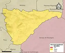 Le retrait-gonflement des sols argileux est susceptible d'engendrer des dommages importants aux bâtiments en cas d’alternance de périodes de sécheresse et de pluie. La totalité de la commune est en aléa moyen ou fort (44,5 % au niveau départemental et 48,5 % au niveau national). Sur les 50 bâtiments dénombrés sur la commune en 2019, 50 sont en aléa moyen ou fort, soit 100 %, à comparer aux 75 % au niveau départemental et 54 % au niveau national. Une cartographie de l'exposition du territoire national au retrait gonflement des sols argileux est disponible sur le site du BRGM[34],[Carte 3].