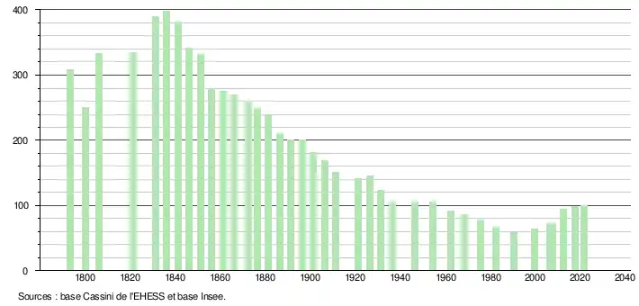 - Population municipale légale en vigueur au 1er janvier 2024, millésimée 2021, définie dans les limites territoriales en vigueur au 1er janvier 2023, date de référence statistique : 1er janvier 2021.
