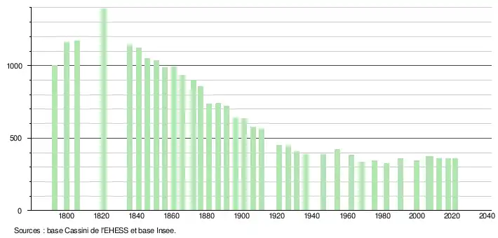 L'évolution du nombre d'habitants est connue à travers les recensements de la population effectués dans la commune depuis 1793. Pour les communes de moins de 10 000 habitants, une enquête de recensement portant sur toute la population est réalisée tous les cinq ans, les populations légales des années intermédiaires étant quant à elles estimées par interpolation ou extrapolation[21]. Pour la commune, le premier recensement exhaustif entrant dans le cadre du nouveau dispositif a été réalisé en 2007[22].