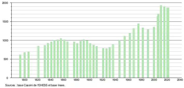 | L'évolution du nombre d'habitants est connue à travers les recensements de la population effectués dans la commune depuis 1793. Pour les communes de moins de 10 000 habitants, une enquête de recensement portant sur toute la population est réalisée tous les cinq ans, les populations légales des années intermédiaires étant quant à elles estimées par interpolation ou extrapolation[25]. Pour la commune, le premier recensement exhaustif entrant dans le cadre du nouveau dispositif a été réalisé en 2005[26]. En 2021, la commune comptait 1 869 habitants[Note 5], en diminution de 1,74 % par rapport à 2015 (Hautes-Pyrénées : +1,04 %, France hors Mayotte : +1,84 %). |