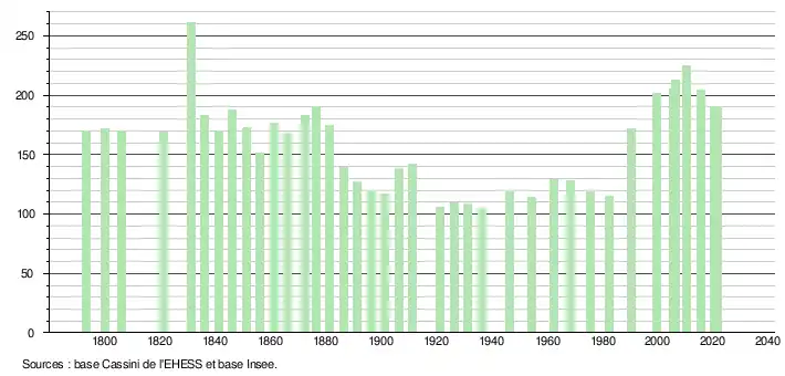 L'évolution du nombre d'habitants est connue à travers les recensements de la population effectués dans la commune depuis 1793. Pour les communes de moins de 10 000 habitants, une enquête de recensement portant sur toute la population est réalisée tous les cinq ans, les populations légales des années intermédiaires étant quant à elles estimées par interpolation ou extrapolation[28]. Pour la commune, le premier recensement exhaustif entrant dans le cadre du nouveau dispositif a été réalisé en 2005[29].