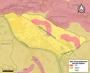Le retrait-gonflement des sols argileux est susceptible d'engendrer des dommages importants aux bâtiments en cas d’alternance de périodes de sécheresse et de pluie. La totalité de la commune est en aléa moyen ou fort (92 % au niveau départemental et 48,5 % au niveau national). Sur les 566 bâtiments dénombrés sur la commune en 2019, 566 sont en aléa moyen ou fort, soit 100 %, à comparer aux 96 % au niveau départemental et 54 % au niveau national. Une cartographie de l'exposition du territoire national au retrait gonflement des sols argileux est disponible sur le site du BRGM[32],[Carte 3].