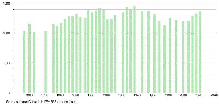 L'évolution du nombre d'habitants est connue à travers les recensements de la population effectués dans la commune depuis 1793. Pour les communes de moins de 10 000 habitants, une enquête de recensement portant sur toute la population est réalisée tous les cinq ans, les populations légales des années intermédiaires étant quant à elles estimées par interpolation ou extrapolation[23]. Pour la commune, le premier recensement exhaustif entrant dans le cadre du nouveau dispositif a été réalisé en 2006[24].