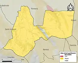 Le retrait-gonflement des sols argileux est susceptible d'engendrer des dommages importants aux bâtiments en cas d’alternance de périodes de sécheresse et de pluie. 97,6 % de la superficie communale est en aléa moyen ou fort (44,5 % au niveau départemental et 48,5 % au niveau national). Sur les 357 bâtiments dénombrés sur la commune en 2019, 354 sont en aléa moyen ou fort, soit 99 %, à comparer aux 75 % au niveau départemental et 54 % au niveau national. Une cartographie de l'exposition du territoire national au retrait gonflement des sols argileux est disponible sur le site du BRGM[21],[Carte 3].