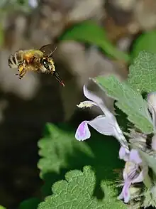 Tube de la corolle droit, fleur recevant la visite d'une abeille sauvage du genre Anthophora