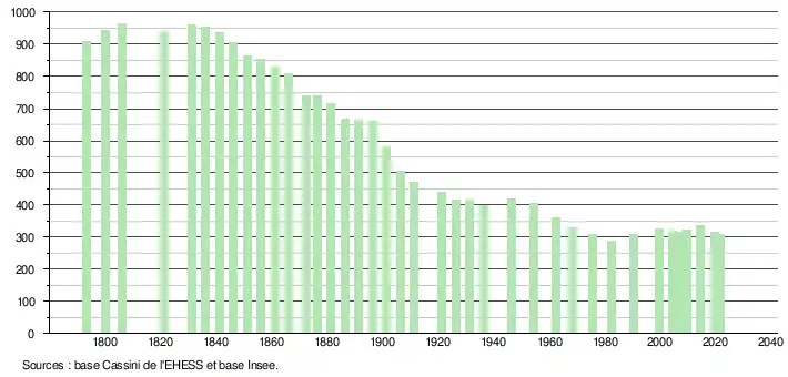 L'évolution du nombre d'habitants est connue à travers les recensements de la population effectués dans la commune depuis 1793. Pour les communes de moins de 10 000 habitants, une enquête de recensement portant sur toute la population est réalisée tous les cinq ans, les populations légales des années intermédiaires étant quant à elles estimées par interpolation ou extrapolation[19]. Pour la commune, le premier recensement exhaustif entrant dans le cadre du nouveau dispositif a été réalisé en 2004[20].