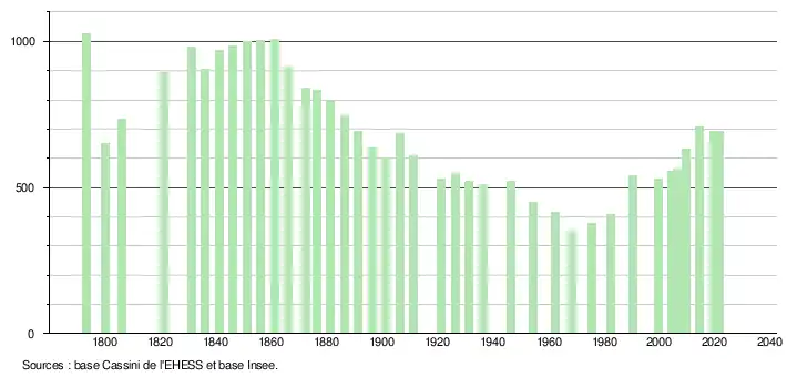 - Population municipale légale en vigueur au 1er janvier 2024, millésimée 2021, définie dans les limites territoriales en vigueur au 1er janvier 2023, date de référence statistique : 1er janvier 2021.
