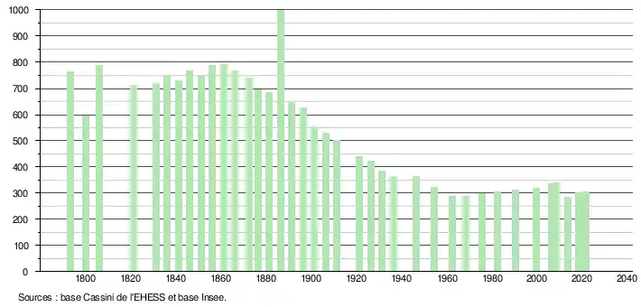 L'évolution du nombre d'habitants est connue à travers les recensements de la population effectués dans la commune depuis 1793. Pour les communes de moins de 10 000 habitants, une enquête de recensement portant sur toute la population est réalisée tous les cinq ans, les populations légales des années intermédiaires étant quant à elles estimées par interpolation ou extrapolation[29]. Pour la commune, le premier recensement exhaustif entrant dans le cadre du nouveau dispositif a été réalisé en 2008[30].
