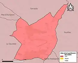 Le retrait-gonflement des sols argileux est susceptible d'engendrer des dommages importants aux bâtiments en cas d’alternance de périodes de sécheresse et de pluie. La totalité de la commune est en aléa moyen ou fort (94,5 % au niveau départemental et 48,5 % au niveau national). Sur les 41 bâtiments dénombrés sur la commune en 2019, 41 sont en aléa moyen ou fort, soit 100 %, à comparer aux 93 % au niveau départemental et 54 % au niveau national. Une cartographie de l'exposition du territoire national au retrait gonflement des sols argileux est disponible sur le site du BRGM[20],[Carte 3].